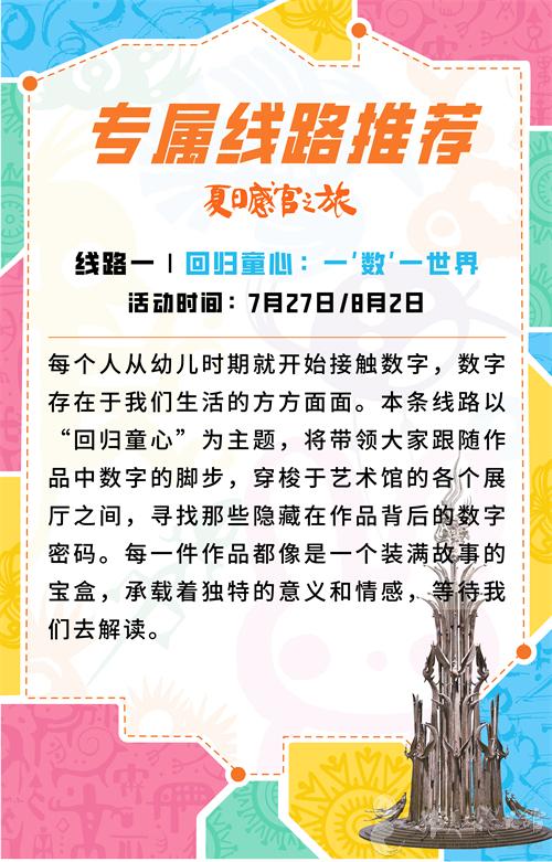 每个人从幼儿时期就开始接触数字,数字存在于我们生活的方方面面。本条线路以“回归童心”为主题,将带领大家跟随作品中数字的脚步,穿梭于艺术馆的各个展厅之间,寻找那些隐藏在作品背后的数字密码。每一件作品都像是一个装满故事的宝盒,承载着独特的意义和情感,等待我们去解读。