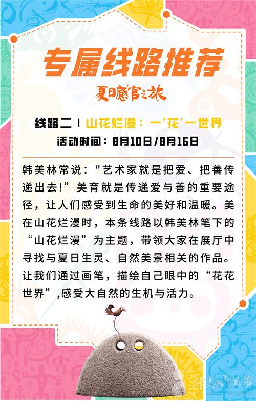 韩美林常说:"艺术家就是把爱、把善传递出去!”而美育就是传递爱与善的重要途径,能让人们感受到生命的美好和温暖。美在山花烂漫时,本条线路以韩美林笔下的“山花烂漫”为主题,带领大家在展厅中寻找与夏日生灵、自然美景相关的作品。让我们通过画笔,描绘自己眼中的“花花世界”,感受大自然的生机与活力。