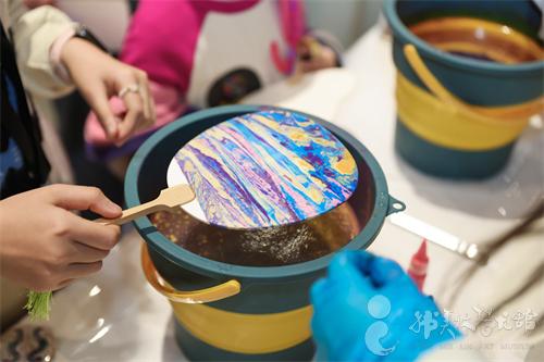 先观察韩美林笔下的山花烂漫作品,欣赏山花的灵动形态与色彩层次,再以沙为墨,通过铺沙、撒沙、勾划等手法,将韩美林笔下的鲜活意趣凝于画盘。在沙粒流动间,亲手复刻艺术经典,感受自然生机与沙画艺术的碰撞。