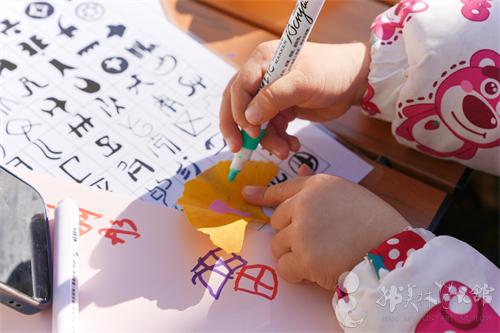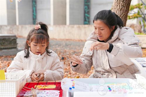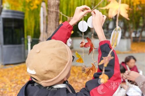 活动刚刚开始,就有不少家长牵着小朋友陆续到来。小朋友们手里紧紧攥着提前捡好的“宝贝落叶”,有的细心装在密封袋中,有的收进心爱的小玩具桶里。工作人员耐心讲解落叶风铃与秋日色卡的制作方法,还特别准备了韩美林的十二生肖卡片,让大家装点在自己的作品上,为这份秋日手作增添一抹独特的“美林韵味”。在工作人员细致的引导下,大家纷纷沉浸在手作的快乐里。现场很快便充满了孩子们的欢声笑语,与创作的细微声响交织在一起。