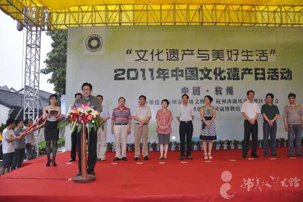 为进一步推动社会各界关注文化遗产保护事业,宣扬文化遗产全民共同参与理念。2011年6月11日下午,由杭州市园林文物局主办的杭州市第六届“中国文化遗产日”广场活动在位于桥西直街的中国扇博物馆的中心广场盛大开幕,本次活动主题为“文化遗产与美好生活”。杭州市副市长张建庭,杭州市园林文物局局长刘颖及各大博物馆、文博单位主要领导出席了开幕活动。刘颖局长对现阶段杭州市文化遗产工作开展情况向大家作了简要介绍,阐述了做好此项工作对提升生活品质的深远意义。随着张市长宣布活动正式开幕,现场气氛达到了高潮。虽然天降豪雨,但还是抵挡不住人们积极参与活动的热情,台下各展位前人头攒动,台上的节目也是异彩纷呈。