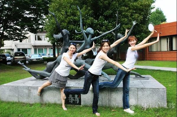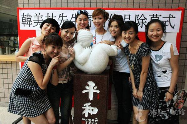 韩美林艺术馆员工与韩美林雕塑作品《青春》