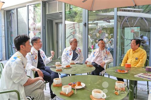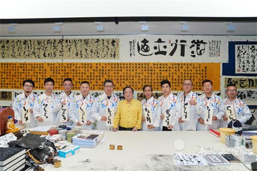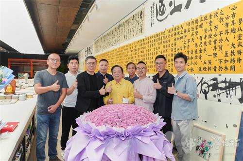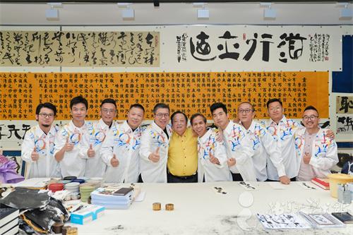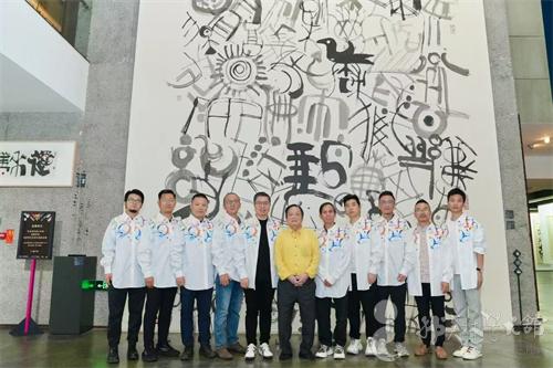 韩美林的学生们身着美林天书艺术元素的衬衣与恩师合影