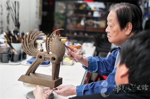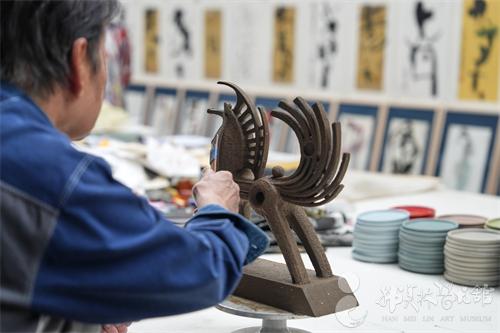 ▲冯骥才仔细查看《天马》的角度是否摆放合适