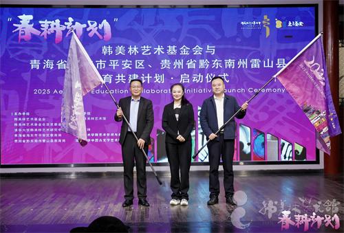 艺术家韩美林,文化和旅游部国际交流与合作局原局长、社会组织党建工作第六组指导员谢金英,国家税务总局征管科技司一级调研员张齐,北京市通州区梨园镇党委副书记丛莉芸,青海省海东市平安区副区长王宁,贵州省黔东南雷山县政府常务副县长刘玉林,韩美林艺术基金会理事长、五地韩美林艺术馆总馆长周建萍,韩美林艺术基金会豆豆基金管委会副主任、噫吁唏艺术馆副馆长李劲松等出席了仪式,来自青海省海东市平安区与贵州省黔东南苗族侗族自治州雷山县的46位美术老师,与韩美林艺术基金会、北京韩美林艺术馆团队共同见证2025“春耕计划”再次扬帆起航。